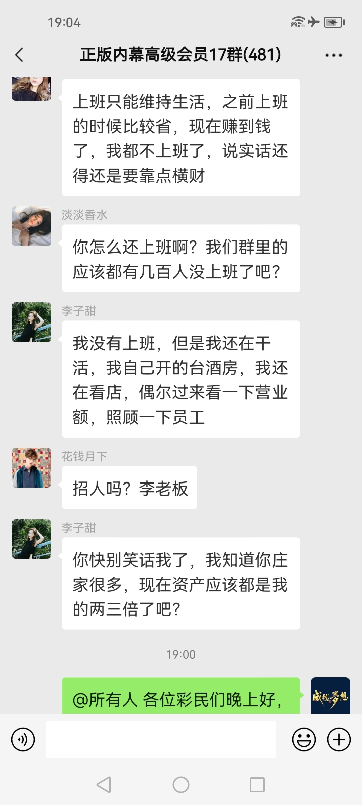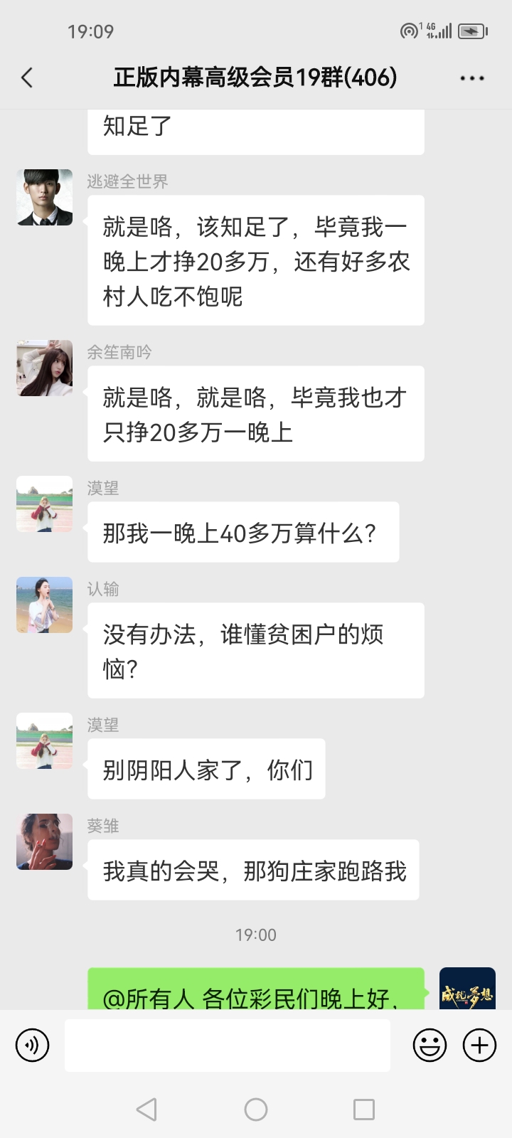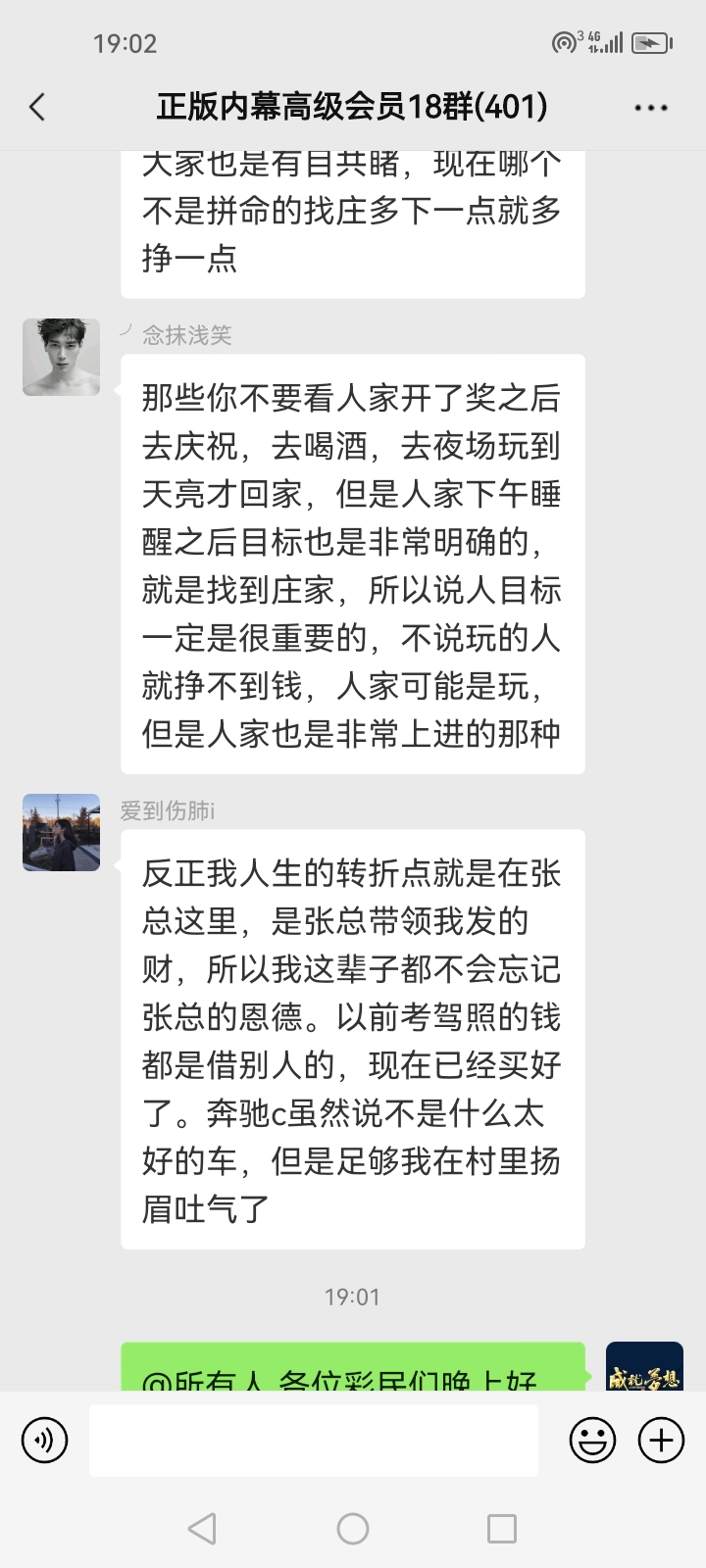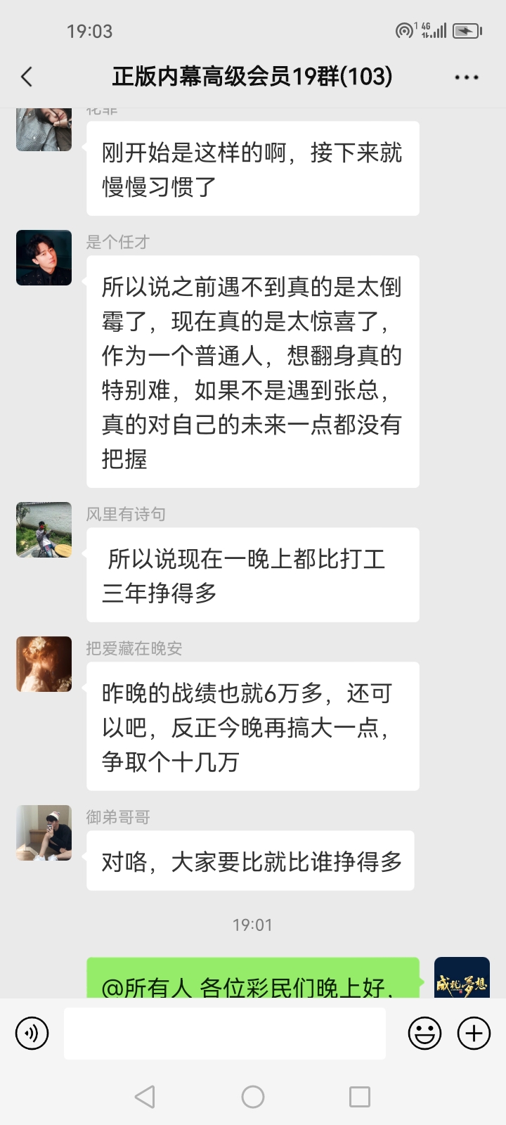 很幸运在茫茫人海中遇见张总,在您的帮助下我昨晚又大中了,真不知道该如何表达对您的万分谢意。刚刚给你转了个19800的红包,说实在的,能一下子不费什么力气就能赚这么多钱实在是有点不敢相信,但是张总确实让这奇迹发生在我的身上了,我的家庭也终于负担没那么重了,原本有三个子女读书,还愁这学费不知上哪整。千言万语道不尽,现在张总您不光是让我解决了这个难题,还让我过上了安逸的生活,以后长期合作,我好好把握的。 |