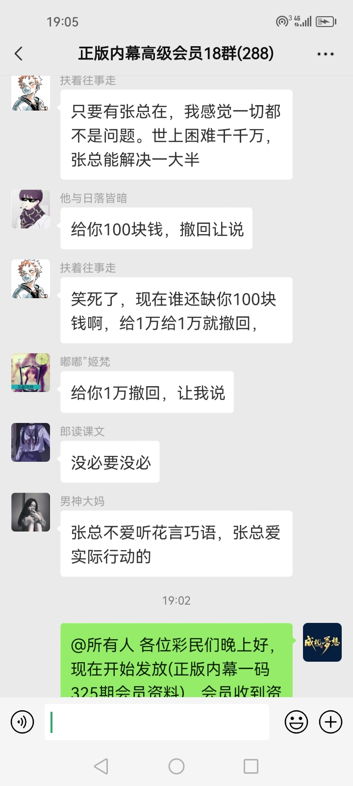 张总,我已经跟你合作三期了,都是连续中奖的,三期我已经赢了30多万了,我知道你说的,别人把握好三期都百万了,但是我这里地方小,黑庄下不大,担心庄家赔不起,所以还请您理解。不过我真的很 感谢你,也希望我们可以长期合作。 |